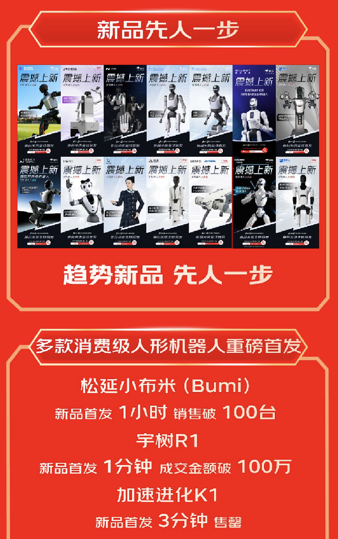 京东持续推动新品首发生态建设,期间智能机器人上新产品数量超百款,多款趋势新品引发抢购热潮。松延小布米(Bumi)新品首发1小时销量突破100台;宇树R1首发仅1分钟成交金额即破百万;加速进化K1更是在上线3分钟内全部售罄,充分印证智能机器人消费正从“关注科技”走向“主动购买”。